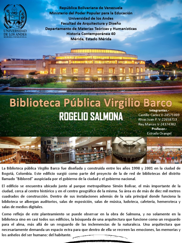 Bibliotec teca virgilio barco universidad catlica de colombia rogelio salmona, bogot, 2002 lugar como temporalidad teora e historia iv, grupo 3 julin camilo angel morales, 199712. Biblioteca pública virgilio barco arquitecto rogelio salmona. Rogelio salmona download rogelio salmona ebook pdf or read online books in. Rogelio salmona, una invitación al viaje. O caminho da escala monumental da paisagem andina, para a intimidade de uma pátios onde salmona lança mão de seu espaço expressivo, configurado por infinidade de texturas a partir de três materiais básicos: